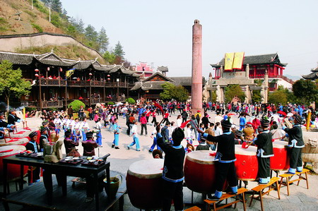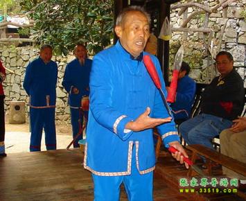 三棒鼓,唐代稱三仗鼓,明沈行符《顧曲雜言》 曰:“吳下何來有打三棒鼓乞錢者,余幼時(shí)有見之也, 起于唐咸通中(公元865年)”約于明代傳入本境, 并逐漸成為群眾增聞樂見的民間藝術(shù)形式。每年春節(jié) ,藝人們結(jié)伴走村竄寨拜年,表演對象不分貧富,戶 戶必到。如遇貧寒之家,表演者將別家贈送禮品相送 ,意在人人過節(jié)歡喜。充分體現(xiàn)出土家族人熱情好客 ,心地善良的民族性格,對加強(qiáng)民族團(tuán)結(jié)有一定作用 。 三棒鼓通常由三至五人組成,一人擊鼓唱詞,一 人鑼鈸配樂,一人?;ò??;ò羧L一尺,舞者 左右手各持一根,將另一根拋在空中,左右開弓,擊 打空中花棒使之不落地。也有以刀代棒,以五刀代三 棒的技藝。技藝高強(qiáng)者,突然把刀拋得極高,來一個(gè) 眼花繚亂,不禁稱絕。打三棒鼓,通常有“鬧春耕” 、“收割打場”、“慶豐收”、“拜年節(jié)”四套,分 “鯉魚跳龍門”、“玉女穿梭”、“板巖漂灘”等項(xiàng) 目。打三棒鼓技巧性強(qiáng),表演時(shí)需高度集中,用力適 當(dāng),貫通一氣,并與演唱者默默配合。