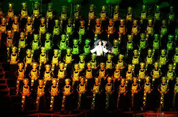 以此基礎進行了藝術再創(chuàng)造,悲傷、歡樂、笑容、淚水交合成一個曲折動人的故事。整場演出體現(xiàn)人物細節(jié),以個性化的敘事結(jié)構(gòu)給人以親近感和頭尾呼應的完整感。汲取世界豐富的音樂文化元素和表現(xiàn)形式,輔之以現(xiàn)代高科技的舞臺特效技術,對世界音樂歌舞劇的一次成功的創(chuàng)新,成為中國山水實景演出的劃時代巨獻。