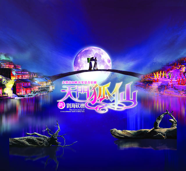 《天門狐仙——新劉??抽浴纺壳笆鞘澜绲谝慌_有完整故事情節(jié)的山水實景音樂歌舞劇。舞臺選址在天門山風景區(qū)山門口內(nèi)至天門山頂?shù)恼麠l峽谷,總投資達到1.2億元,演員隊伍達530多人。主舞臺以10000平米的玻璃鋼打造,是目前世界最大的全景玻璃鋼舞臺。音樂主創(chuàng):譚盾。