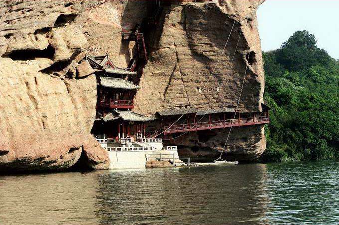 水巖在旱仙巖北面,靠上清河兩岸,因臨水而名,以碧水丹山而聞名遐邇,主體在西岸。要主景點(diǎn)有古棧道遺址、飛云閣、棋盤石、“仙女獻(xiàn)花”、仙梳石、金鐘峰、仙勺石、雌雄石等。怪石奇巖,滿山紛陳,隨處是景,目不暇接。從龍虎山莊附近乘船行不遠(yuǎn),對岸即是水巖,只見崖壁貼岸,陡立如屏,古樹橫生,藤蔓垂掛,山崖上古棧道遺址依然存在。在崖壁上有許多名人題刻,如“玉壁凌空”、“半天仙跡”、“神仙可接”等。至一峽口上岸,左側(cè)即絕壁獨(dú)立的“仙女獻(xiàn)花”。沿山徑上山,一路美景不斷。對岸亦是高峰聳立河邊,上清河蜿蜒中間,青山碧水,幽景迷人。