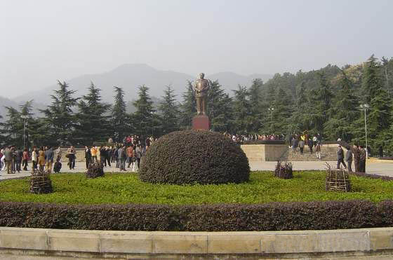 毛澤東銅像位于韶山沖的中心,紀(jì)念館、毛氏宗祠與韶山賓館之間。銅像區(qū)占地5200平方米,是經(jīng)中共中央批準(zhǔn)興建紀(jì)念毛澤東同志誕辰100周年的重點(diǎn)獻(xiàn)禮工程。這里原是一片沃野,地勢平坦開闊,周圍群山拱護(hù)。韶蜂在遠(yuǎn)處,高峻挺拔,云富坨大山巍峨雄壯,十八羅漢山逶迤綿長,黑石寨鐵骨錚錚。在山的襯托下,銅像更顯得氣勢磅礴。