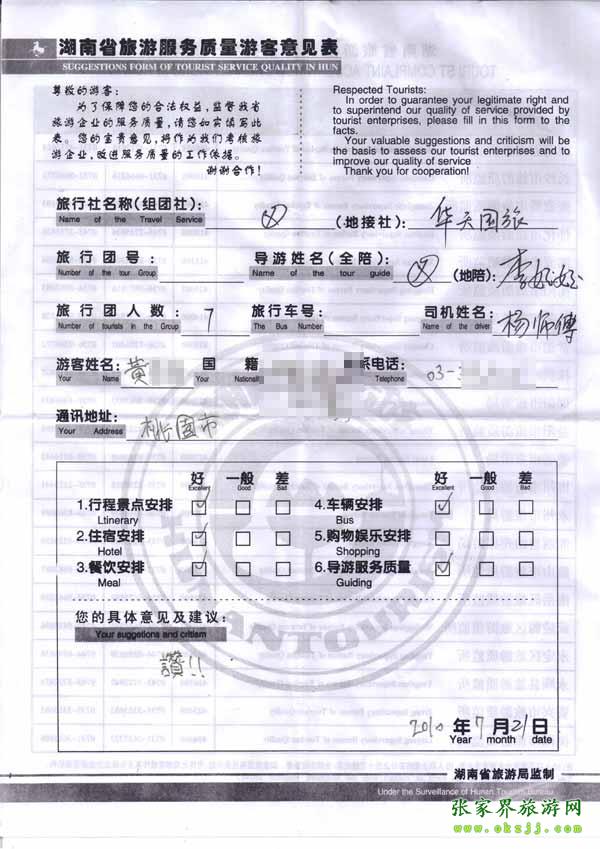 2010年7月21日臺(tái)灣黃小姐一行7位旅游質(zhì)量反饋