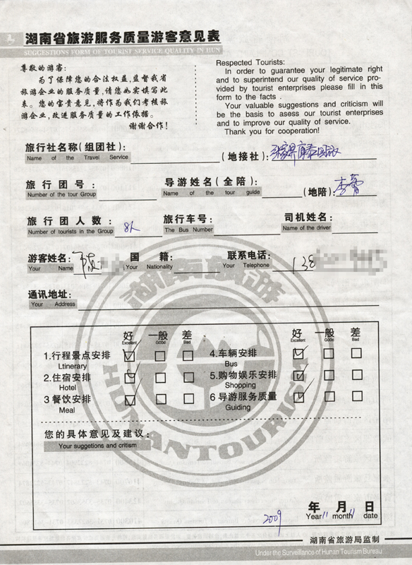 2009年11月11日陳先生一行8人旅游接待質量反饋單: