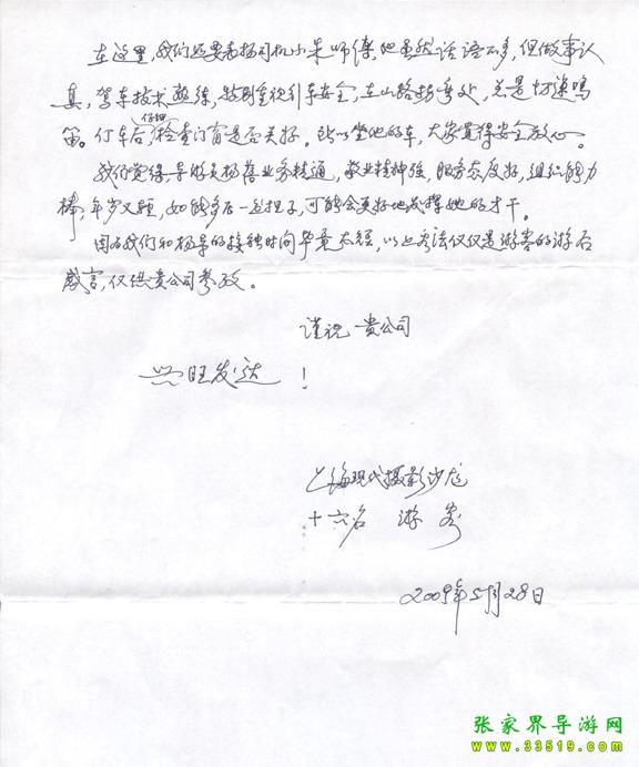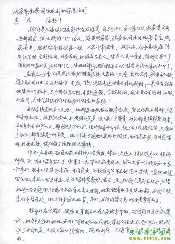 2009年5月19日“上海現(xiàn)代攝影沙龍”一行16人,參加張家界旅游導(dǎo)游網(wǎng)組織的張家界旅游跟團,于2009年5月25日結(jié)束行程。游玩期間,由于導(dǎo)游楊蓓的出色講解和周到的服務(wù),得到客人的一致好評??腿颂丶谋頁P信一封,如下: