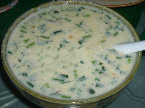 是土家人每年二月“社日”必食的“佳節(jié)飯”。其作法是先于節(jié)日前上山扯來野蔥、社菜,洗凈剁碎,放于鍋中焙干。煮飯時(shí),先將肥臘肉炒香,鏟出待用。煮飯時(shí)以三分糯米和一分秈米混煮,秈米半熟后方下糯米,然后將米湯濾凈,放進(jìn)社菜、胡蔥和臘肉,攪拌均勻,陰火燜熟。揭開鍋蓋,香氣盈室,其味妙不可言。