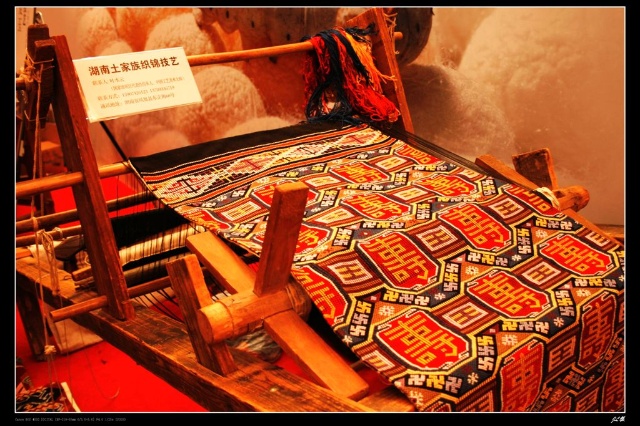 土家織錦,就是土家姑娘用一種古老的木腰機,以棉紗為經(jīng),對五彩絲線或棉線(當今也有用毛線)為緯,完全用手工織成的手工藝術品。土家織錦的藝術品種,經(jīng)過一兩千年的演變,現(xiàn)在已發(fā)展到100多個,除原有的“西蘭卡普”(即被面花)以外,又根據(jù)時代的變化織出了各種圖案的壁掛、香袋、服飾、旅游袋、沙發(fā)套、坐墊、地毯、室內(nèi)裝飾等多種工藝美術品。聰明的土家姑娘,她們心靈手巧,表現(xiàn)山水,表現(xiàn)人物,表現(xiàn)樹木花卉與飛禽走獸,形象逼真,栩栩如生。 土家織錦產(chǎn)區(qū)主要分布在龍山縣苗兒灘、張家界、撈車及靛房、坡腳;永順縣縣對山、風棲;保靖縣的普絨、清水等地。春秋戰(zhàn)國時期,“表布”(即土家錦)即已成為貢品。