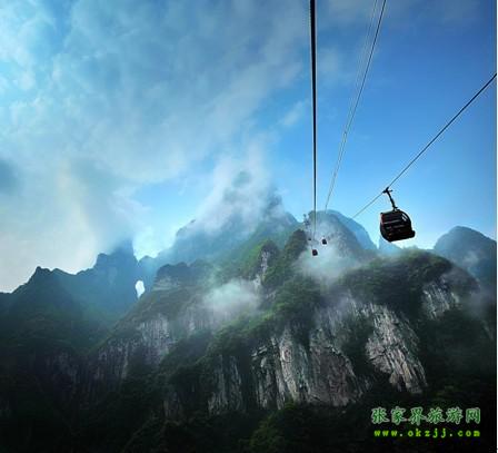 ![]() 纜車從天門山主峰云夢(mèng)仙頂至天門山寺前櫻桃灣廣場,總長度800米,單程運(yùn)行約10分鐘,為無遮蓋的雙人吊椅式,是天門山山頂?shù)囊粭l絕佳空中觀景長廊。乘坐纜車緩緩飄行在林海之上,絕美的空中原始花園盡收眼底,白云裊裊,滿目碧翠,時(shí)有飛鳥在腳下掠過,時(shí)有樹梢花朵似探手可及。神仙般的瀟灑飄逸和無比的心曠神怡讓人流連忘返。