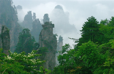 第二天   游覽世界峰林奇觀森林公園(248元已含,兩天有效)—天子山景區(qū):西海、天臺、仙女獻(xiàn)花、御筆峰、賀龍公園、臥龍嶺、十里畫廊,中途參觀百丈峽,住武陵源索溪峪